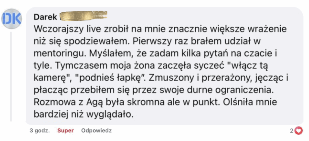 Spotkania mentoringowe, które oferuję są bezcenne – jestem w stanie z łatwością rozpoznać co blokuje Cię, aby ruszyć do przodu i jak poprowadzić Cię do rozwiązania, nawet jeżeli Twój problem wydaje Ci się nie do rozwiązania. Spotkania Live będą prowadzone przez pewien czas (jeszcze nie wiem jak długo), a potem będzie dostęp do nagrań wszystkich spotkań Live.