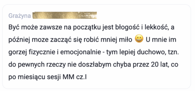 Od wielu lat taka forma pracy przynosi cuda tysiącom osób korzystających z moich sesji czy kursów. Wynika to nie tylko z mojej bardzo bogatej wiedzy, którą nabywałam jeszcze w czasie studiów fizyki kwantowej na Uniwersytecie Jagiellońskim, ale także w czasie kilkunastuletniego doświadczenia w pracy własnej i z setkami osób – indywidualnie i grupowo.