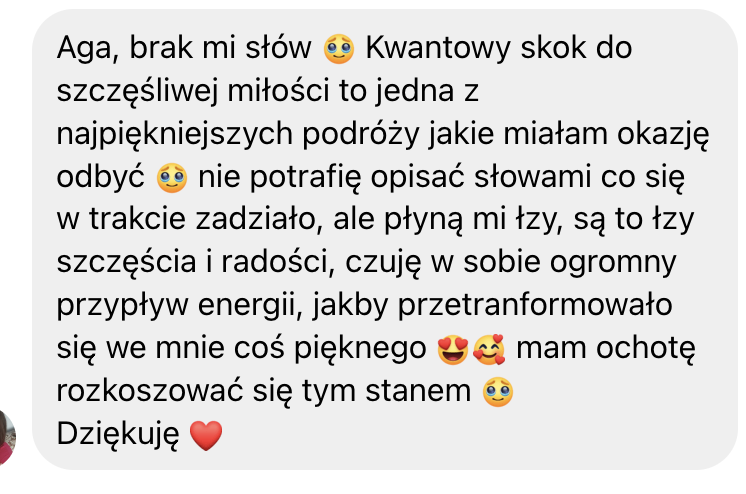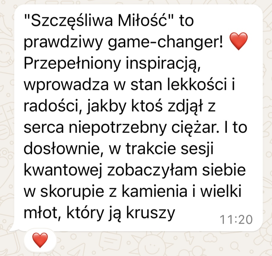 „Szczęśliwa miłość” to niezwykła podróż, w której Twoja nadświadomość prowadzi Cię krok po kroku przez kluczowe kwantowe skoki do Twojej miłości… czy to z aktualnym partnerem, czy to z kimś zupełnie nowym, czy to z bliźniaczym płomieniem czy z bratnią duszą, a może po prostu z samym sobą…