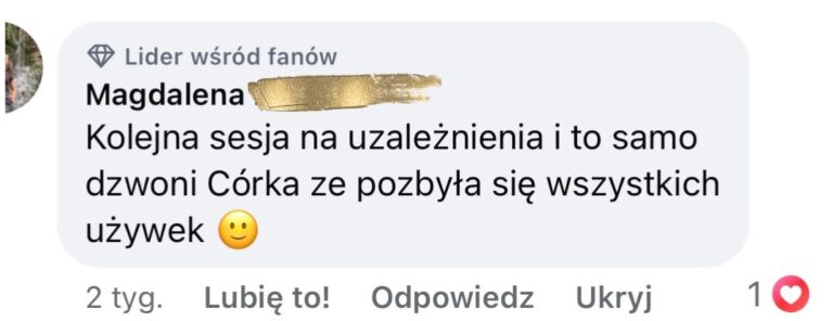Już wiele osób po sesji ze mną rzuciło lub ograniczyło swoje nałogi, uzależnienia. Wiele osób uwolniło się z uzależnienia emocjonalnego od innych osób. Mój pierwszy przypadek, z którym pracowałam to alkoholizm. Już 1 krótka sesja spowodowała, że problem zaczął znacząco zanikać, a po 3 sesjach uzależnienie zniknęło.